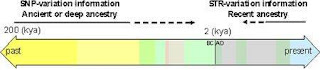 Blijkbaar treedt de SNP variatie veel minder vaak op dan de hierboven beschreven STR variatie. Dat wil zeggen dat SNPs worden gebruikt om de wereldbevolking in specifieke groepen in te delen met als oorsprong Oost Afrika, zo'n 200.000 jaar geleden. De STR variaties beschrijven verwantschappen tot circa 2000 jaar geleden (zie ook Genebase en de presentatie in het Engels).